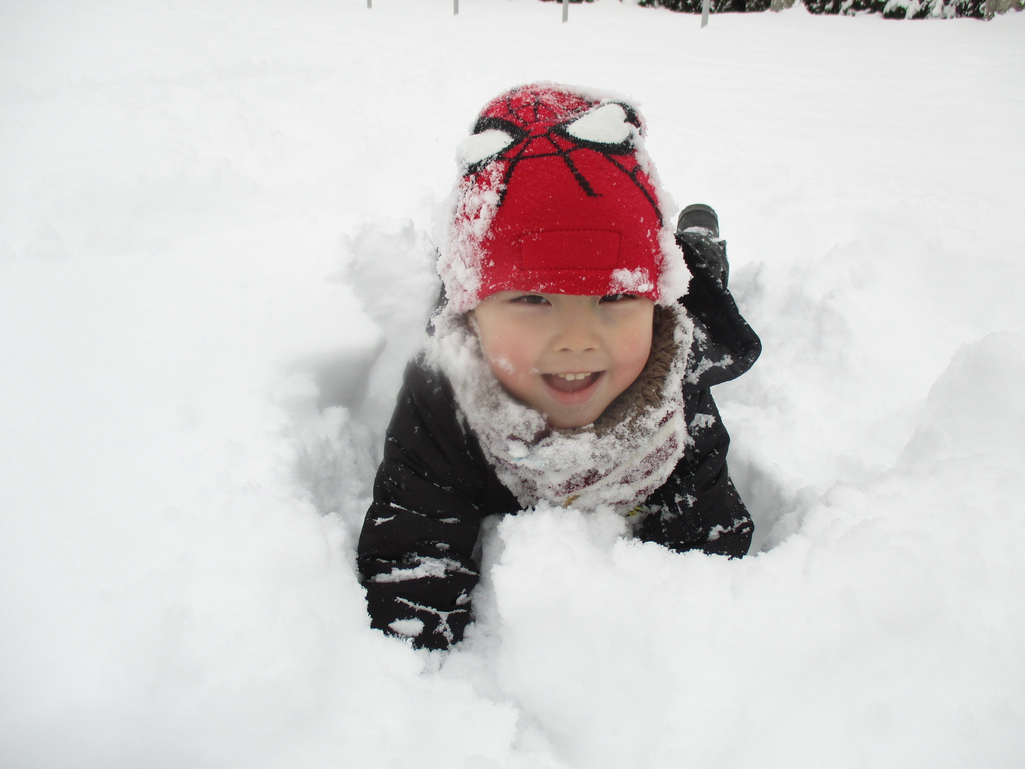 雪を上に投げて、雪を降らせて遊ぶお友だちや